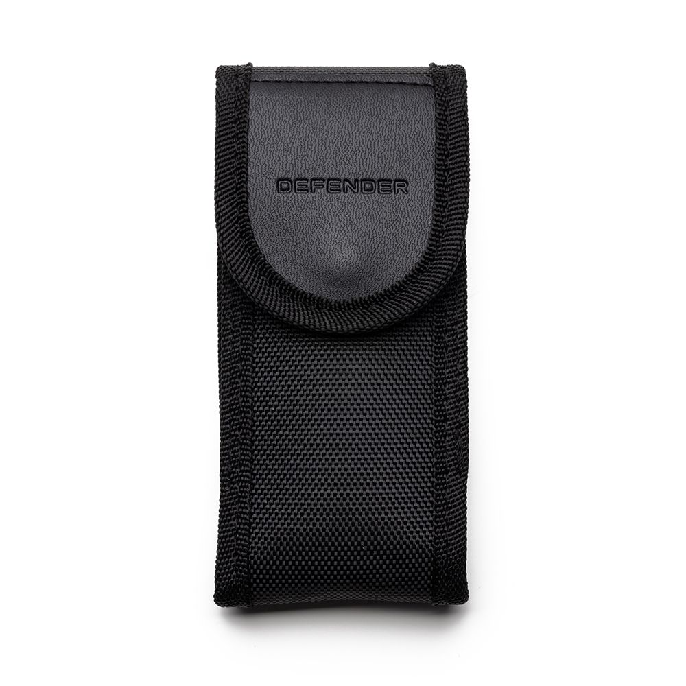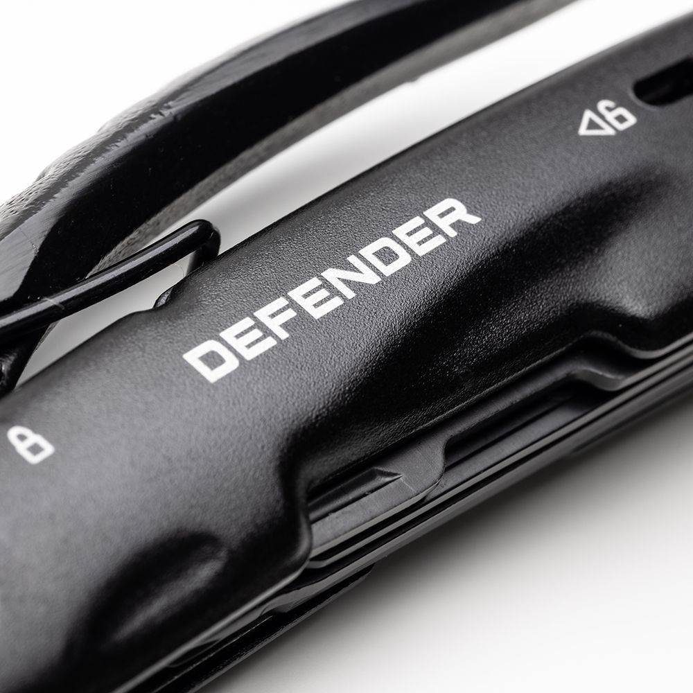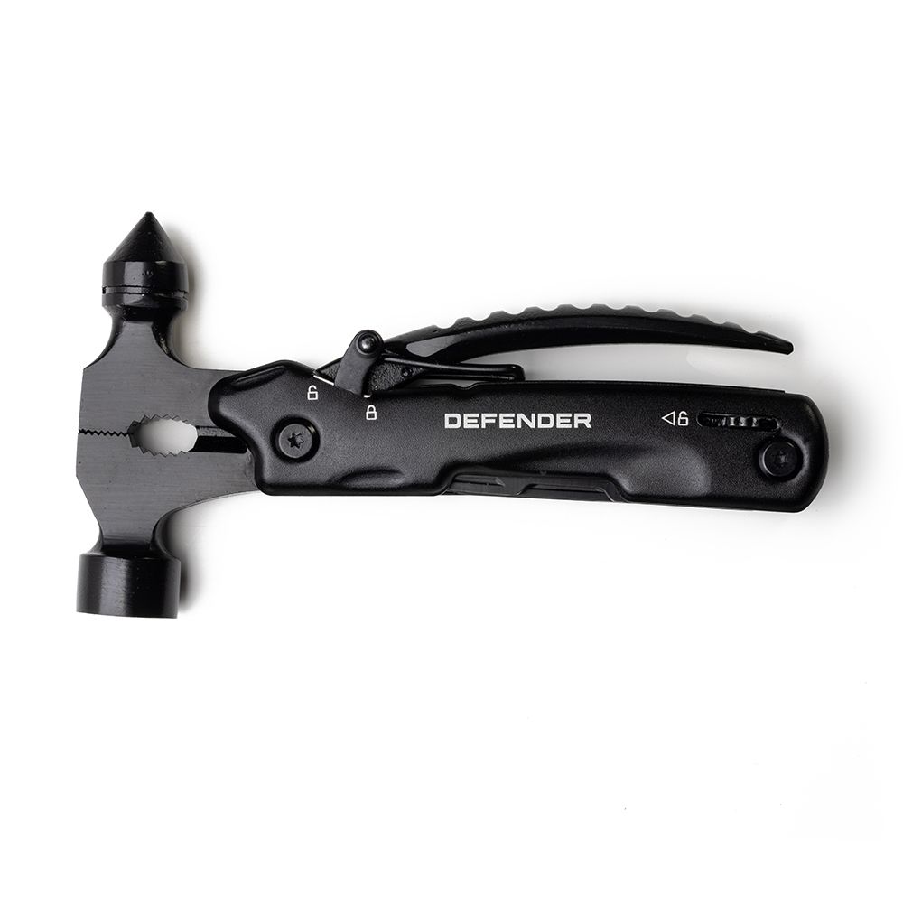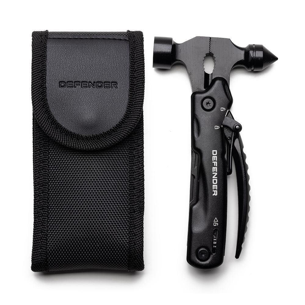 Advanced multi-tool with matte-black hardware. Fabricated in durable anodised metal. Finished with white Defender logo. Comes with a handy carry pouch.