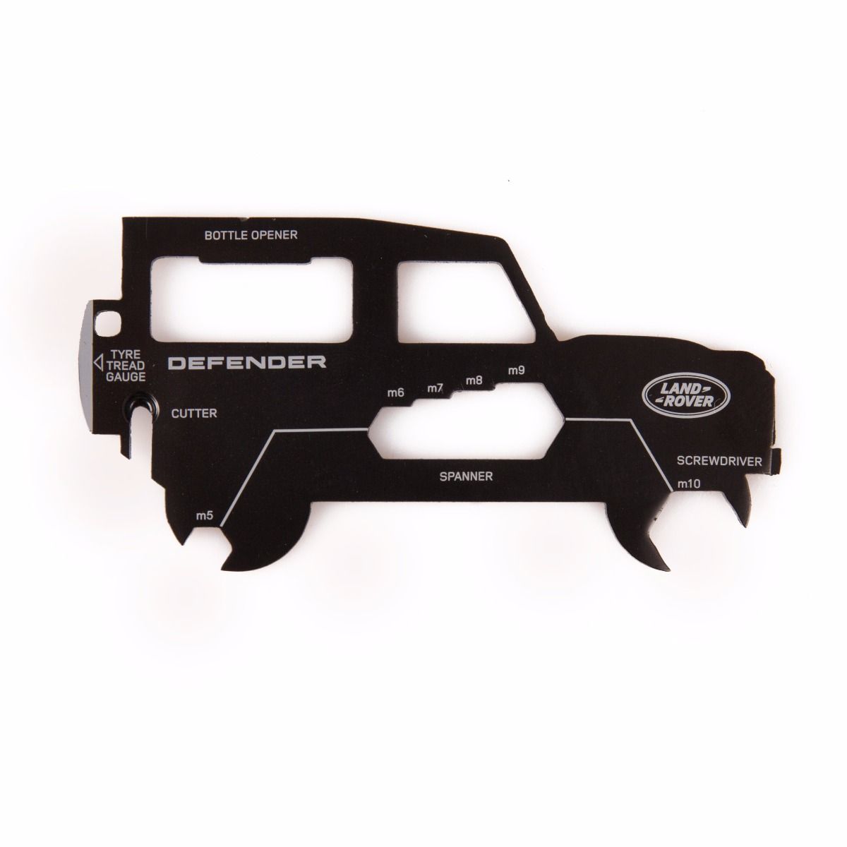 Black steel credit card sized multi tool crafted into the classic Defender silhouette. Featuring 11 practical tools. Including: bottle opener and tyre gauge.